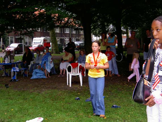 Toeschouwers bij de waterglijbaan op het Stuivesantplein.