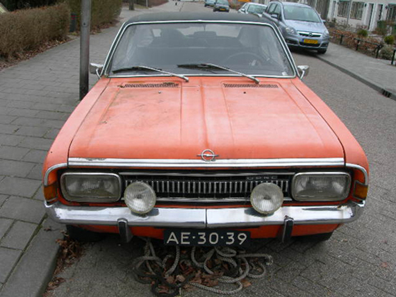 Hij staat met zijn rug naar me toe. Het is een normale auto-achterkant op het eerste oog, wel knaloranje. Een tweede blik laat zien dat de auto een oud Nederlands nummerbord heeft, er staat “AE-30-39” en is donkerblauw met wit, een oldtimer dus. Hoe dichter ik bij de auto kom, hoe meer tekens duidelijk worden, hoe meer littekens ook. Het ijzeren logo laat een cirkel zien met een horizontale bliksemschicht erdoorheen, dit zegt me dat de auto een Opel is, een Opel Dodge verteld nader onderzoek. “Commodore 6 2500” staat er ook. Commodore zal zijn naam wel zijn, en de 6 staat voor het aantal cilinders. Ik heb geen verstand van auto’s dus dat “2500” zegt me letterlijk niks. De achterklep staat een stukje open, er zit mos op en er hangt een groen touwtje aan wat hem denk ik dichthoudt. Op de achterruit is een witte sticker geplakt met de tekst “I (hartje) coffeeshops”, het rode hartje is wat vervaagt.