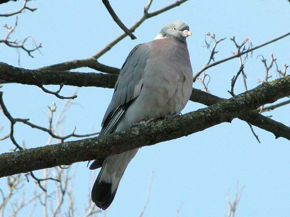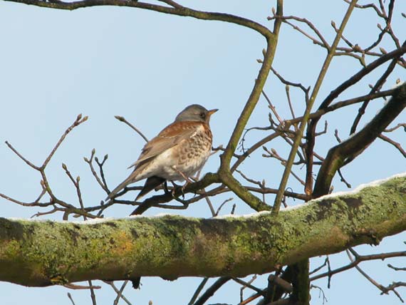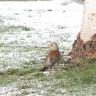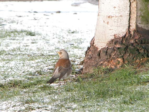 Kramsvogel bij de door honden wit geplaste stamvoet.