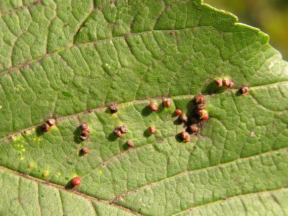 Voor de larven van esdoorngalmugjes worden op het blad deze kleine rode 'huisjes' gebouwd.