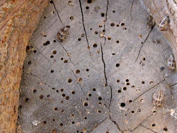De plek van een de afgezaagde takken is nu het leefgebied voor houtwormen.