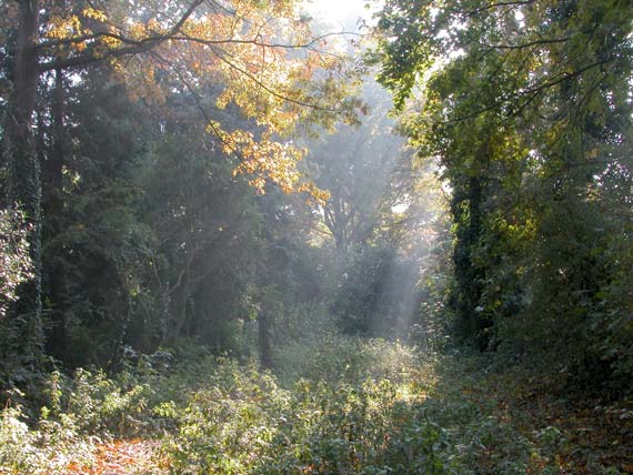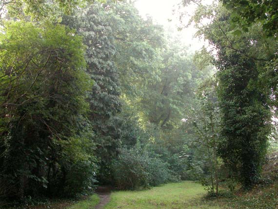 Het 'hulst-moereiken-esdoornbos' op een nevelige ochtend in de late zomer.