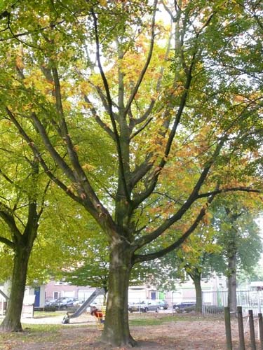 Heeft groot, in het najaar roodbruin verkleurend blad met spitse punten.