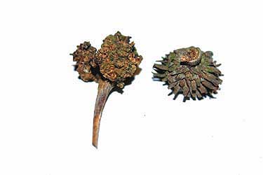 Galachtig groeisel en rechts daarvan eikeldopje, gevonden door Thomas van Esch