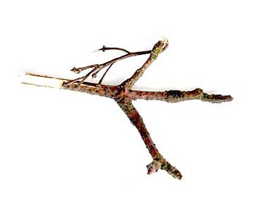 Stukje tak met nog oude steeltjes van bloemen en latere zaden, gevonden door Thom de Bel