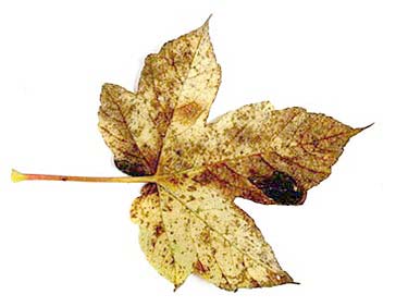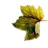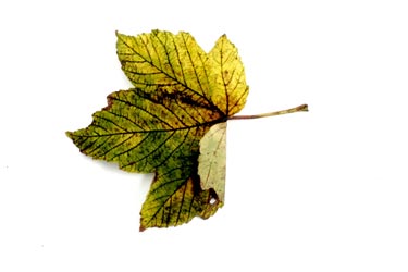 Geel verkleurd herfstblad met zwarte vlekken van een schimmel, gevonden door Michèlle van Doremalen
