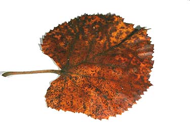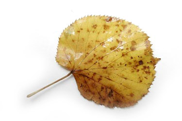 Geel herfstblad met nerven die door een schimmel donker zijn gekleurd. gevonden door Sybe Stieger