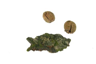 Twee oude vruchtjes en stukje schors, gevonden door Kris van Kasteren